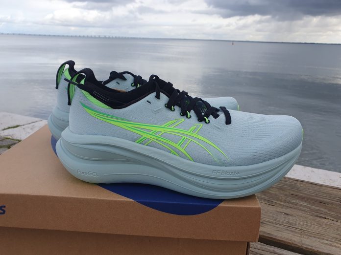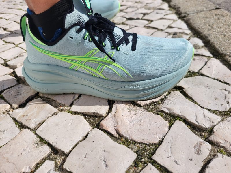 A ASICS mete no Nimbus 28 a combinação FF BLAST PLUS e PureGEL, prometendo uma passada leve e suave.
